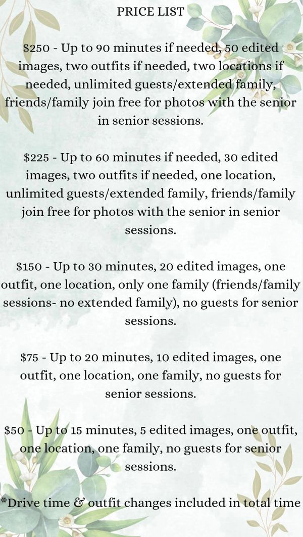 We offer price plans to fit your needs! This list is only a quick summary of our plans and what they include. Please message with questions and for further detail.